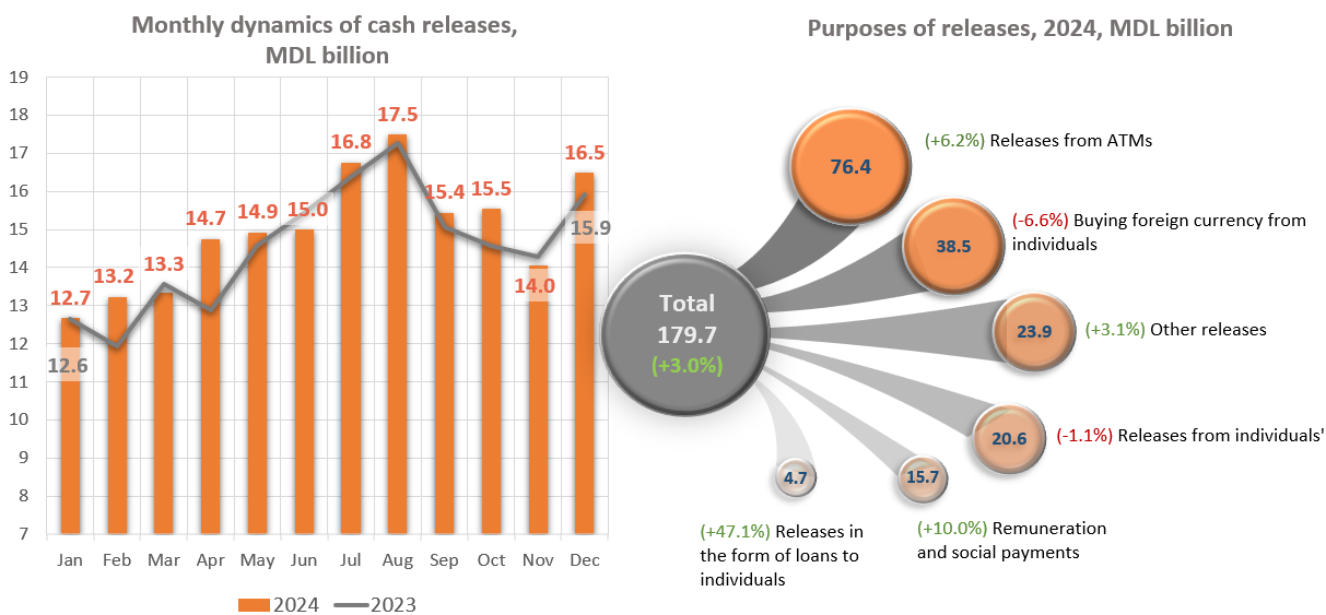 The volume of cash releases from banks vaults in 2024 increased by MDL 5,156.8 million (+3.0%) compared to the same period of the previous year and amounted to MDL 179,670.8 million (Chart 2).