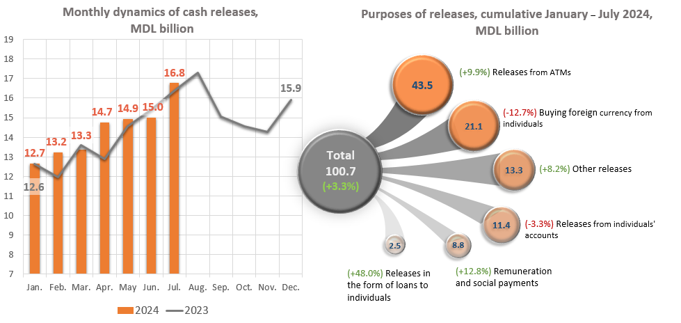The volume of cash releases from banks vaults in January – July 2024 increased by MDL 3,252.1 million (+3.3%) compared to the same period of the previous year and amounted to MDL 100,669.3 million (Chart 2).