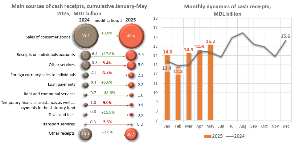 The volume of cumulative cash receipts in January-May 2025 increased by MDL 2,696.6 million (+4.0%) compared to the similar period of the previous year and amounted to MDL 70,837.7 million.