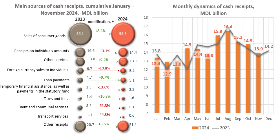 In January – November 2024 the volume of cumulative cash releases from banks vaults exceeded the volume of cumulative cash receipts in the banking system1 by MDL 4,776.4 million.