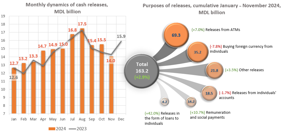 The volume of cash releases from banks vaults in January – November 2024 increased by MDL 4,578.6 million (+2.9%) compared to the same period of the previous year and amounted to MDL 163,177.6 million (Chart 2).