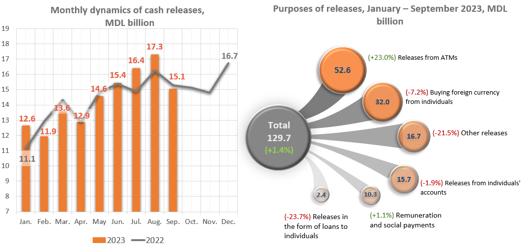 In January - September 2023, the volume of cumulative cash releases from bank vaults exceeded the volume of cumulative cash receipts in the banking system1 by MDL 1,560.5 million.