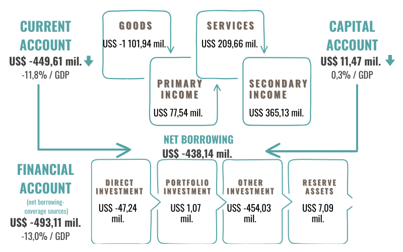 According to preliminary data, in Quarter I, 2024, the current account of the balance of payments recorded a deficit of US$ 449,61 million and improved by 9,9% as compared to the similar period of the previous year. The current account to GDP ratio amounted to -11,8%. The capital account recorded a positive balance amounting to US$ 11,47 million, and the financial account recorded a net inflow of US$ 493,11 million