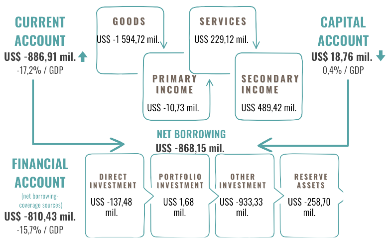 According to preliminary data, in Quarter III, 2024, the current account of the balance of payments recorded a deficit of - US$ 886,91 million and increased by 60,2% as compared to the similar period of the previous year. The current account to GDP ratio amounted to -17,2%. The capital account recorded a positive balance amounting to US$ 18,76 million, and the financial account recorded a net inflow of US$ 810,43 million.