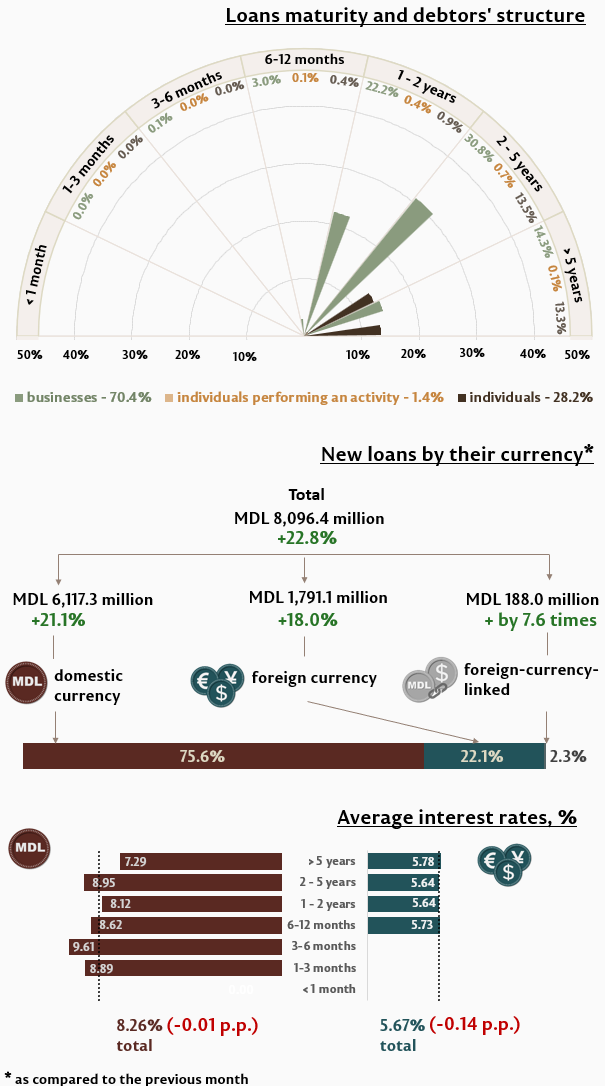 In December 2024, new granted loans1 (Infographic 1) amounted to MDL 8,096.4 million, increasing by 22.8% compared to November 2024. The largest share (75.6%) represents domestic currency loans, which totalled MDL 6,117.3 million, increasing by 21.1% as compared to the previous month.