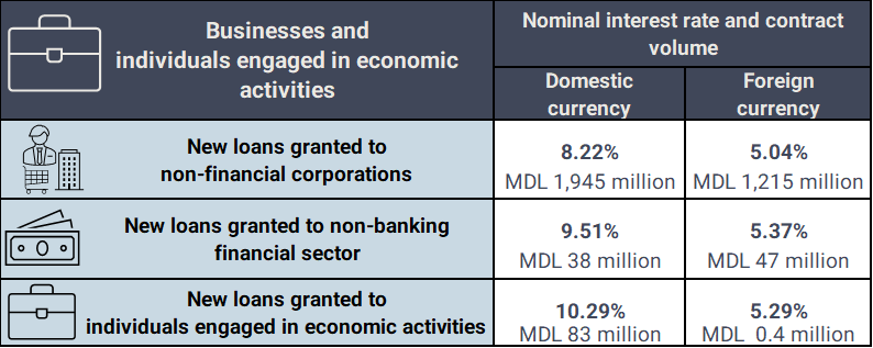 New loans1 granted in January 2026 amounted to MDL 5,254 million, of which 64.5% were contracted by businesses and individuals engaged in economic activities and 35.5% by individuals. The volume of new loans granted to businesses and individuals engaged in economic activities and the corresponding nominal interest rates are presented in the table below.