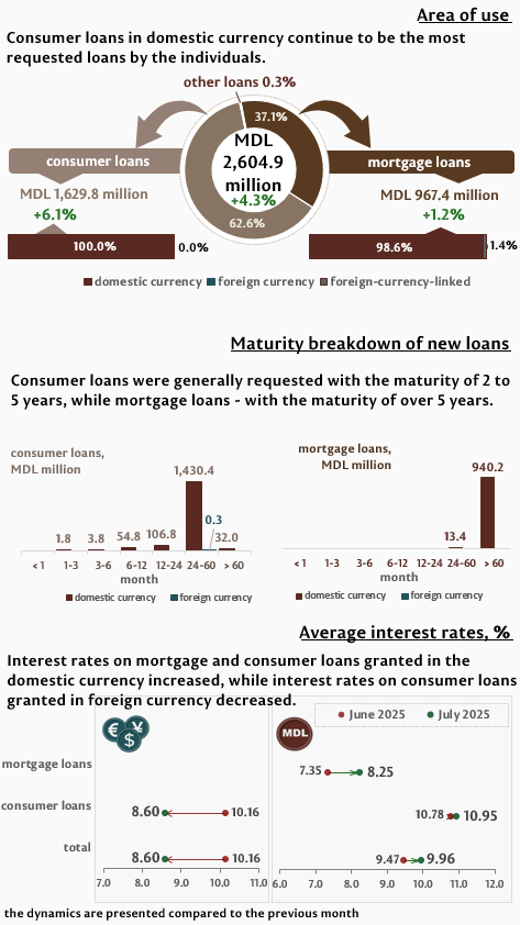 In July 2025, individuals contracted new loans in total amount of MDL 2,604.9 million, increasing by 4.3% as compared to the previous month, the largest share (62.6%) representing consumer loans (Infographic 2). The largest part of consumer loans granted to individuals (MDL 1,430.4 million) was granted in domestic currency with a maturity ranging from 2 to 5 years.