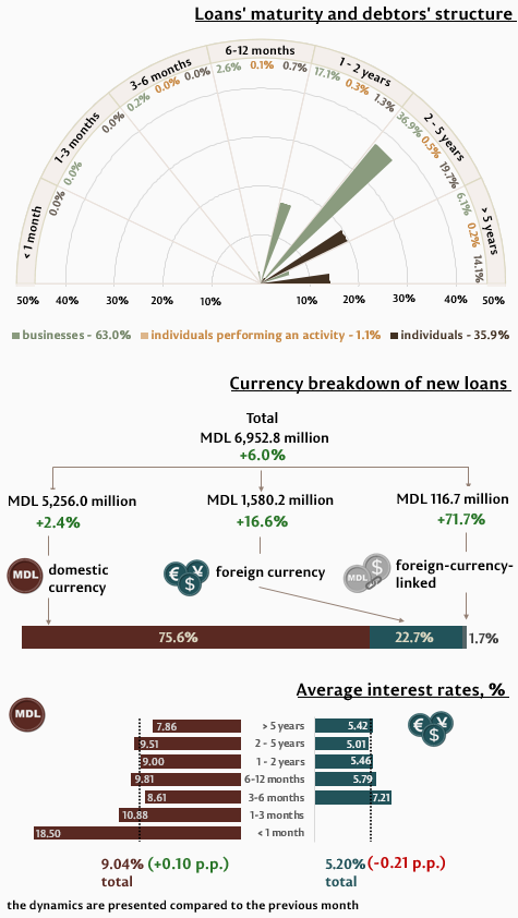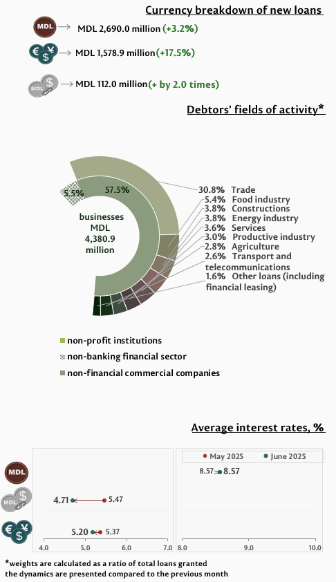 In June 2025, new granted loans1 amounted to MDL 6,952.8 million, increasing by 6.0% compared to May 2025 (Infographic 1). The largest share (75.6%) represents domestic currency loans, which totalled MDL 5,256.0 million, increasing by 2.4% as compared to the previous month.