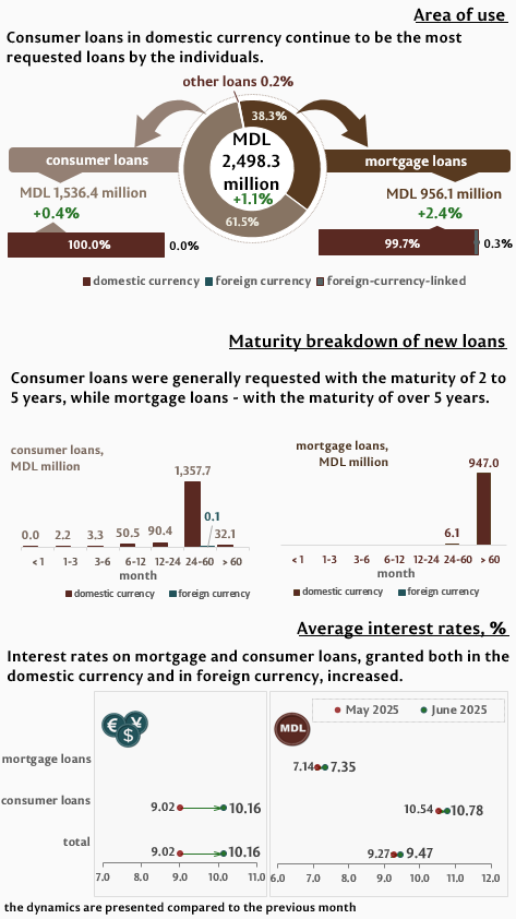In June 2025, individuals contracted new loans in total amount of MDL 2,498.3 million, increasing by 1.1% as compared to the previous month, the largest share (61.5%) representing consumer loans (Infographic 2). The largest part of consumer loans granted to individuals (MDL 1,357.7 million) was granted in domestic currency with a maturity ranging from 2 to 5 years.