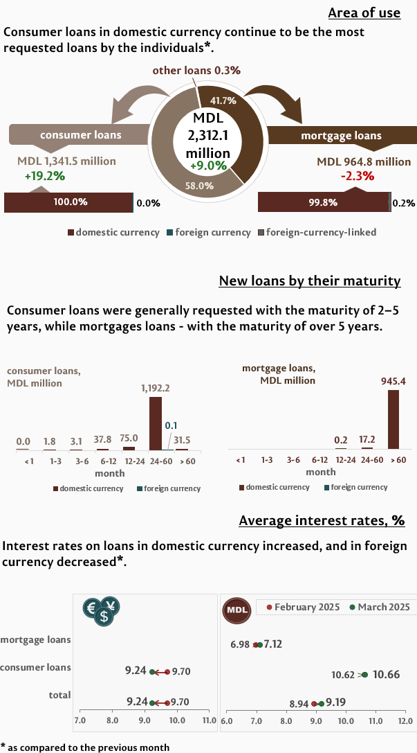 In March 2025, individuals contracted new loans (Infographic 2) in total amount of MDL 2,312.1 million, increasing by 9.0% as compared to the previous month, the largest share (58.0%) representing consumer loans. The largest part of consumer loans granted to individuals (MDL 1,192.2 million) was granted in domestic currency with a maturity ranging from 2 to 5 years.