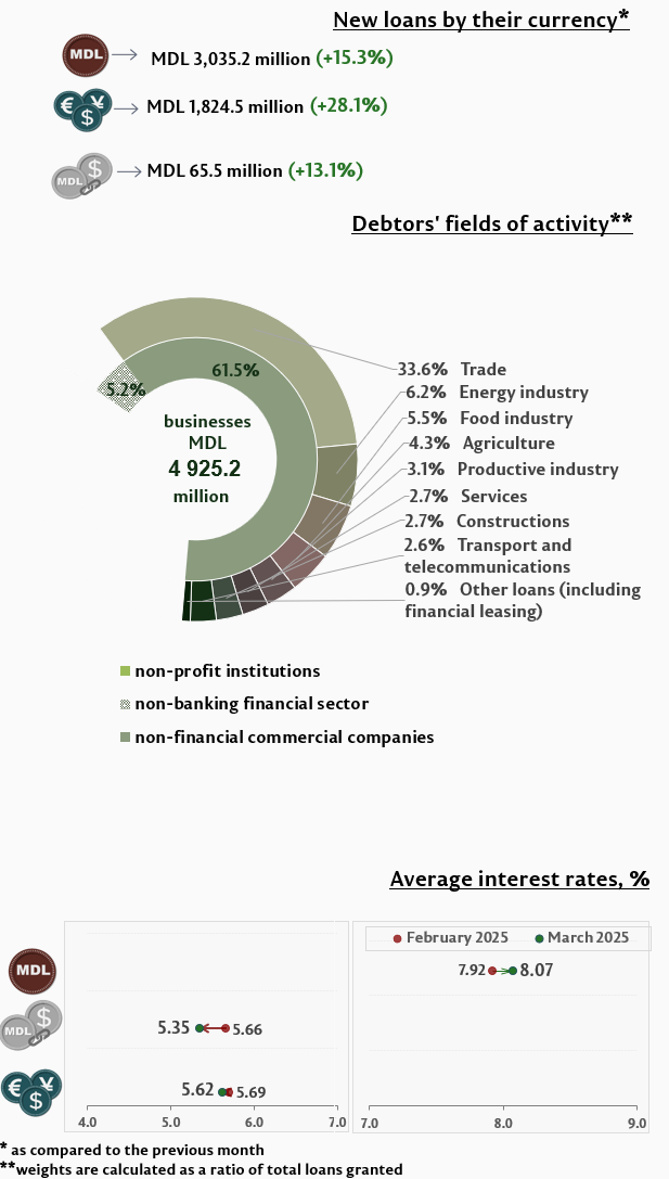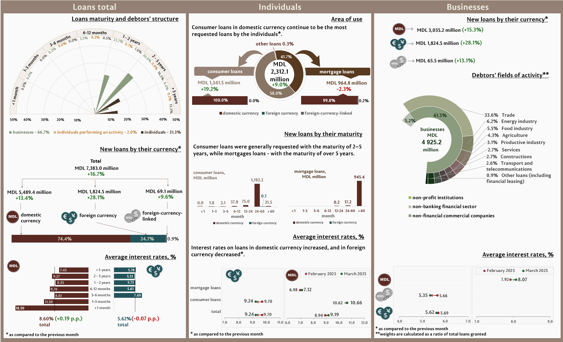 In March 2025, newly granted loans1 (Infographic 1) amounted to MDL 7,383.0 million, increasing by 16.7% compared to February 2025. The largest share (74.4%) represents domestic currency loans, which totalled MDL 5,489.4 million, increasing by 13.4% as compared to the previous month.