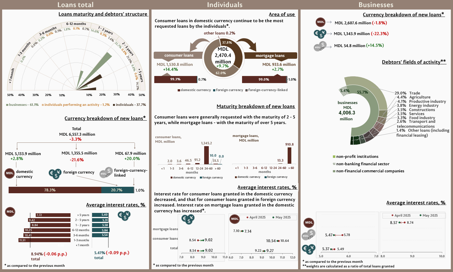 In May 2025, new granted loans1 (Infographic 1) amounted to MDL 6,557.3 million, decreasing by 3.3% compared to April 2025. The largest share (78.3%) represents domestic currency loans, which totalled MDL 5,133.9 million, increasing by 2.8% as compared to the previous month.