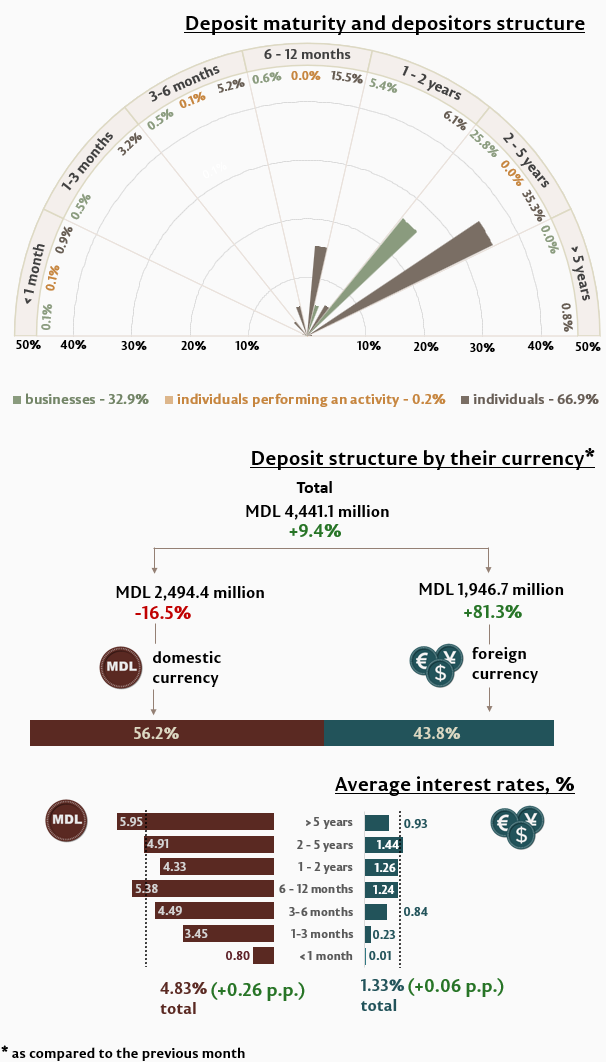 Individuals’ deposits amounted in April 2025 to MDL 2,971.0 million, decreasing by 3.1% compared to the previous month (Infographic 2). The most requested were deposits with terms from 2 to 5 years (52.8% of the total deposits of individuals) and deposits with maturities from 6 to 12 months (23.1%). Compared to April 2024, deposits in the national currency of individuals increased by 80.6%, while those in foreign currency increased by 36.6%.