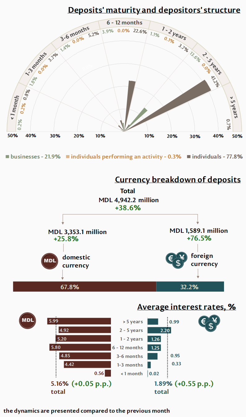 New term deposits attracted1 in December 2025 totalled MDL 4,942.2 million, increasing by 38.6% as compared to November 2025 (Infographic 1). Deposits attracted in domestic currency recorded a share of 67.8% and totalled MDL 3,353.1 million, increasing by 25.8% as compared to the previous month. Deposits attracted in foreign currency totalled MDL 1,589.1 million, being 76.5% higher than in the previous month.