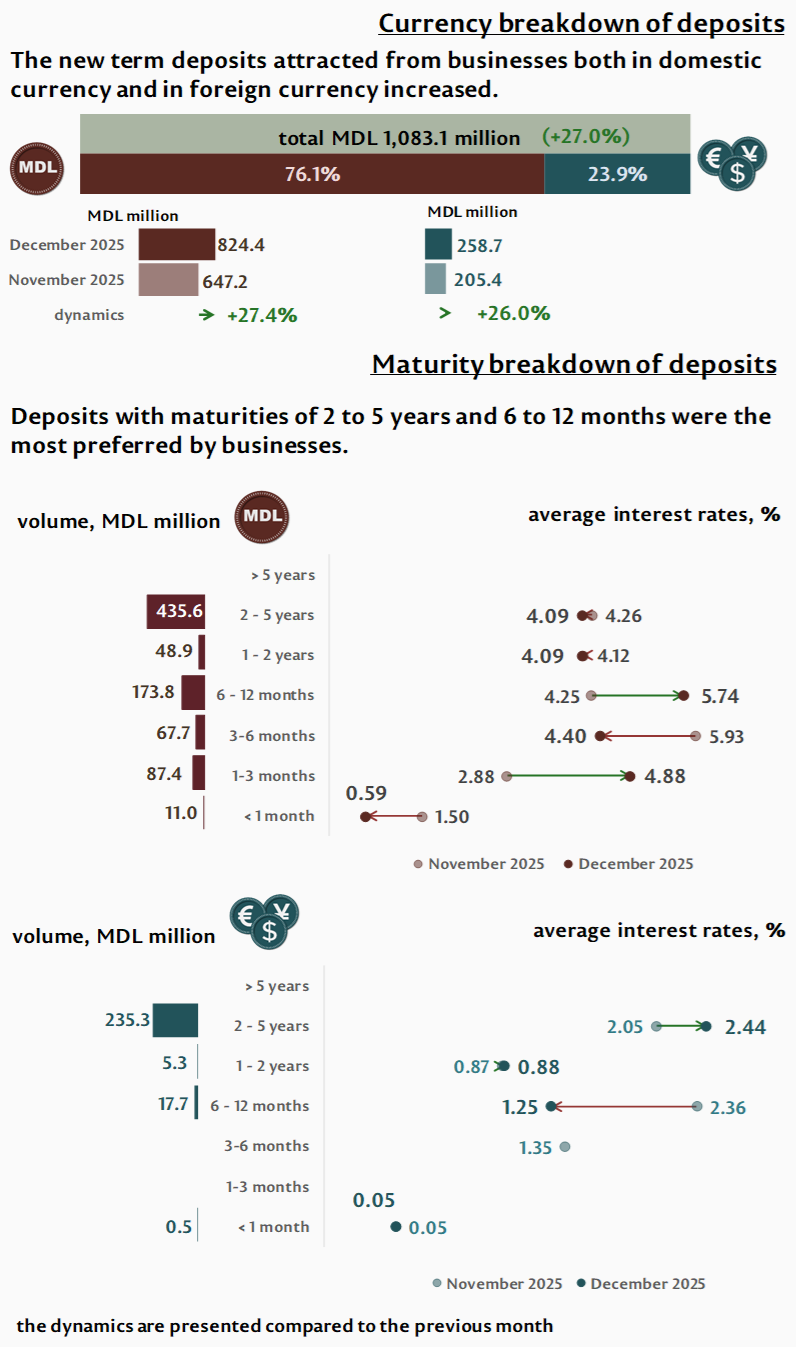 In December 2025, businesses’ new term deposits totalled MDL 1,083.1 million, increasing by 27.0% as compared to the previous month. Deposits in domestic currency amounted to MDL 824.4 million (+27.4%), while those in foreign currency – MDL 258.7 million (+26.0%). Compared to December 2024, businesses’ deposits in domestic currency decreased by 47.3%, while their deposits in foreign currency decreased by 45.1%.