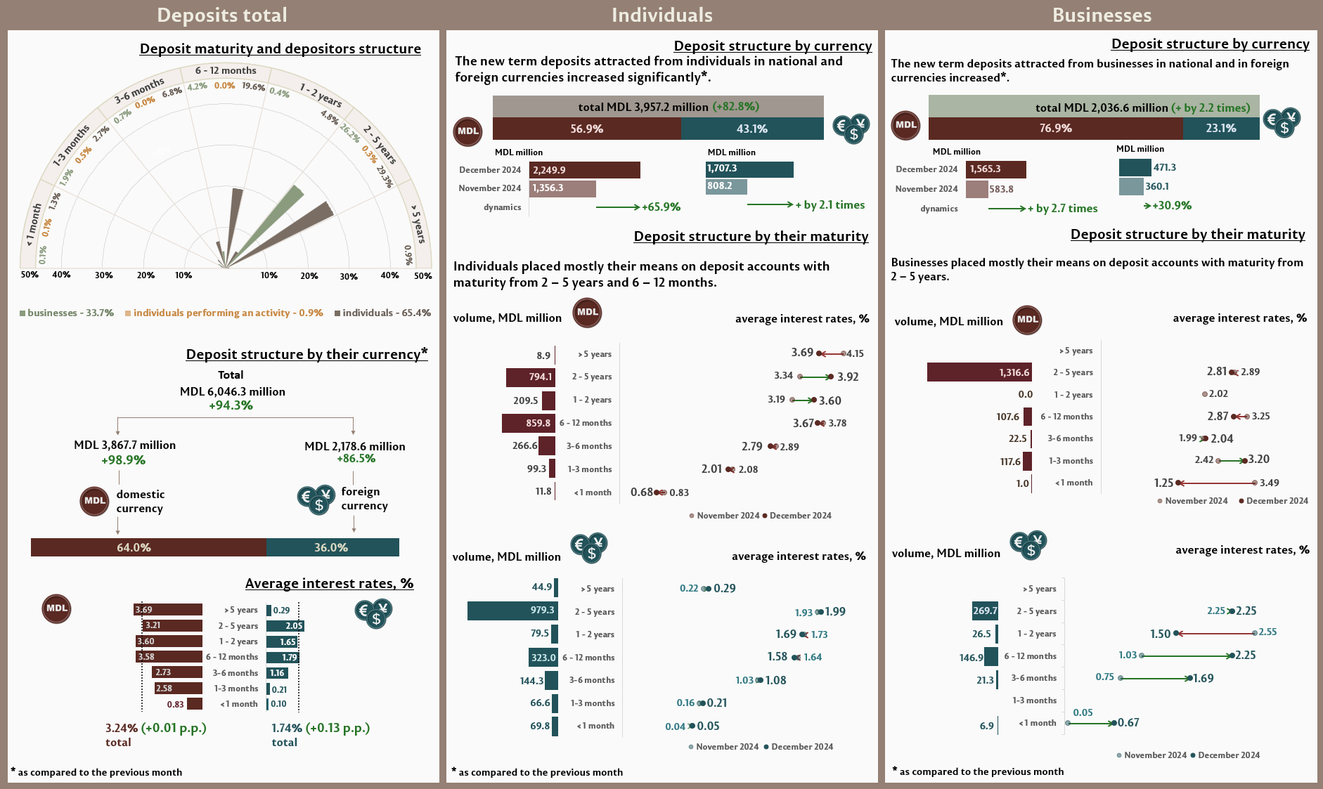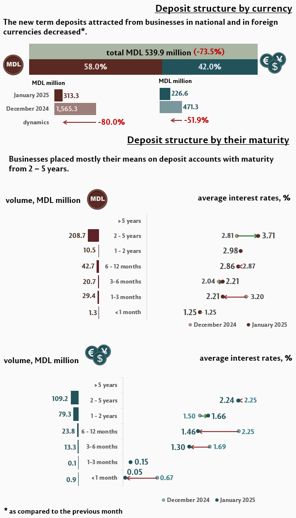 In January 2025, businesses’ deposits in domestic currency (Infographic 3) decreased significantly by 80.0%, while those in foreign currency decreased by 51.9%, as compared to the previous month. Businesses’ deposits in domestic currency amounted to MDL 313.3 million, while those in foreign currency – MDL 226.6 million. Compared to January 2024, deposits in the national currency of businesses decreased by 60.7%, while those in foreign currency increased by 30.1%.