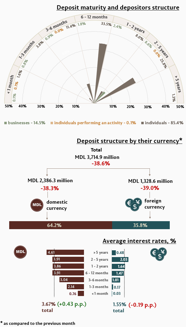 In January 2025, new term deposits attracted1 (Infographic 1) totalled MDL 3,714.9 million, decreasing by 38.6% as compared to December 2024. Deposits attracted in domestic currency recorded a major share of 64.2% and totalled MDL 2,386.3 million, decreasing by 38.3% as compared to the previous month. Deposits attracted in foreign currency totalled MDL 1,328.6 million, being 39.0% lower than in the previous month.