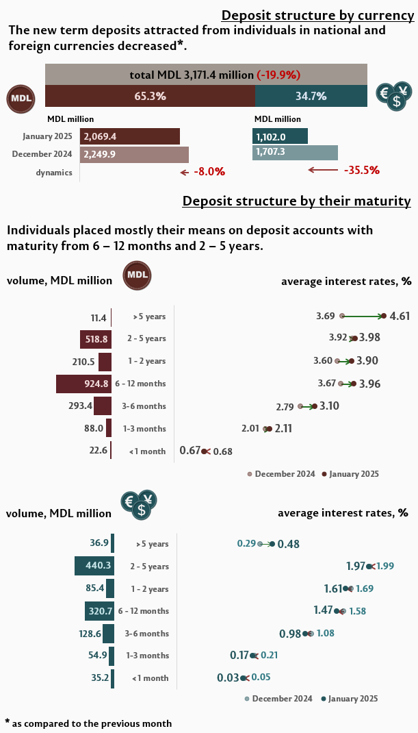 Individuals’ deposits amounted in January 2025 to MDL 3,171.4 million, decreasing by 19.9% as compared to the previous month (Infographic 2). The most requested were deposits with terms from 6 to 12 months (39.3%) and deposits with maturities from 2 to 5 years (30.2%) of the total deposits of individuals. Compared to January 2024, deposits in the national currency of individuals decreased by 20.5%, while those in foreign currency increased by 15.6%.