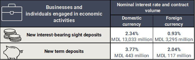 New deposits1 attracted in January 2026 amounted to MDL 24,746 million, with 68.2% placed by the businesses and individuals engaged in economic activities and 31.8% by individuals. The volume of new contracts with the businesses and individuals engaged in economic activities and the nominal interest rates are presented in the table below.