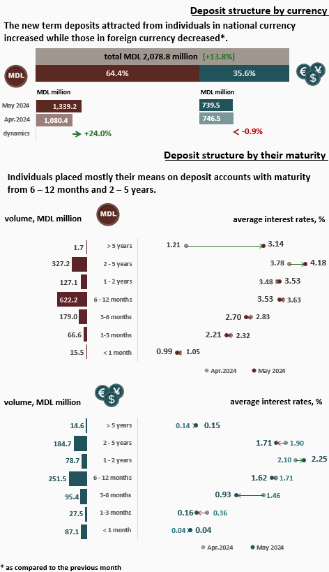 Individuals’ deposits amounted in May 2024 to MDL 2,078.8 million, increasing by 13.8% as compared to the previous month (Infographic 2). The most requested were deposits with terms from 6 to 12 months, which held a share of 42.0% of the total deposits of individuals.