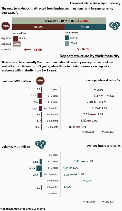 In May 2024, businesses’ deposits in domestic currency decreased by 36.0%, while those in foreign currency – by 0.3%, as compared to the previous month (Infographic 3). Businesses’ deposits in domestic currency amounted to MDL 335.9 million, while those in foreign currency – MDL 265.3 million.