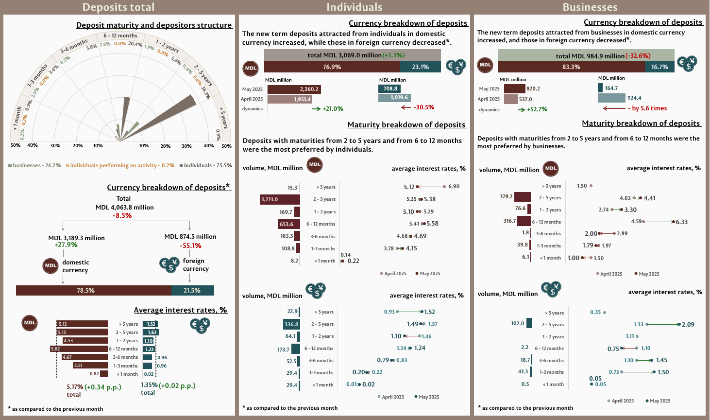 New term deposits attracted1 in May 2025 totalled MDL 4,063.8 million, decreasing by 8.5% as compared to April 2025 (Infographic 1). Deposits attracted in domestic currency recorded a share of 78.5% and totalled MDL 3,189.3 million, increasing by 27.9% as compared to the previous month. Deposits attracted in foreign currency totalled MDL 874.5 million, being 55.1% lower than in the previous month.