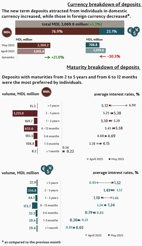 In May 2025, individuals’ deposits amounted to MDL 3,069.0 million, increasing by 3.3% as compared to the previous month (Infographic 2). Deposits with maturities from 2 to 5 years and from 6 to 12 months were the most preferred, representing 50.8% and 27.0% of individuals’ total deposits, respectively. Compared to May 2024, individuals’ deposits in the domestic currency increased by 76.2%, while those in foreign currency decreased by 4.2%.