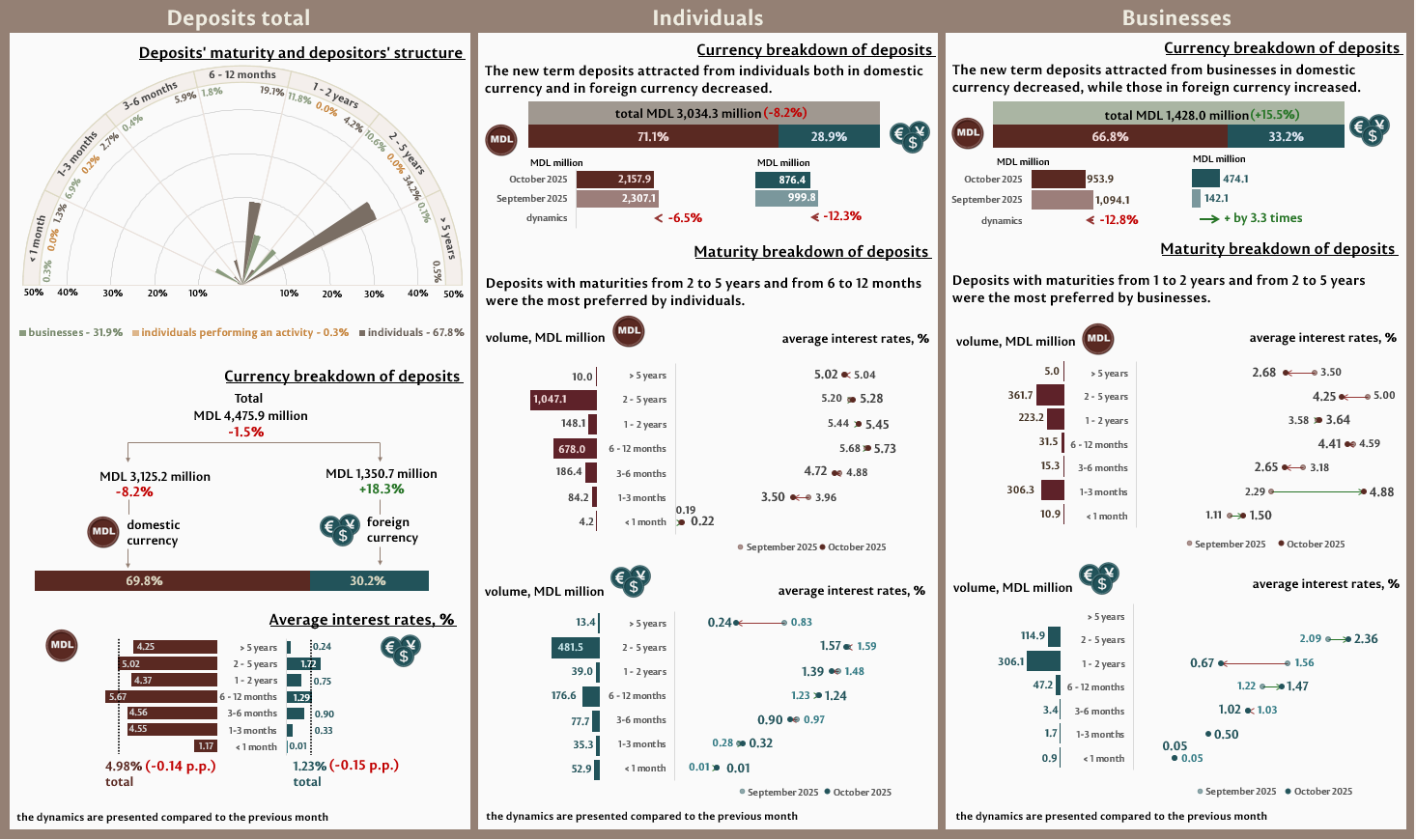 In October 2025, businesses’ new term deposits totalled MDL 1,428.0 million, increasing by 15.5% as compared to the previous month. Deposits in domestic currency amounted to MDL 953.9 million (-12.8%), while those in foreign currency – MDL 474.1 million (+ by 3.3 times). Compared to October 2024, businesses’ deposits in domestic currency increased by 15.7 %, while their deposits in foreign currency increased by 2.3 times.