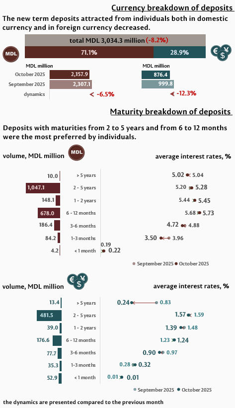 In October 2025, individuals’ deposits amounted to MDL 3,034.3 million, decreasing by 8.2% as compared to the previous month (Infographic 2). Deposits with maturities from 2 to 5 years and from 6 to 12 months were the most preferred, representing 50.4% and 28.2% of individuals’ total deposits, respectively. Compared to October 2024, individuals’ deposits in domestic currency increased by 59.1%, while those in foreign currency – by 7.2%.