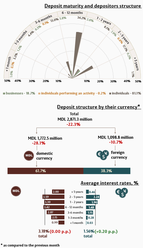 In September 2024, businesses’ deposits in domestic currency decreased by 63,2% (Infographic 3), while those in foreign currency by 23.2%, as compared to the previous month. Businesses’ deposits in domestic currency amounted to MDL 327.4 million, while those in foreign currency – MDL 210.2 million.