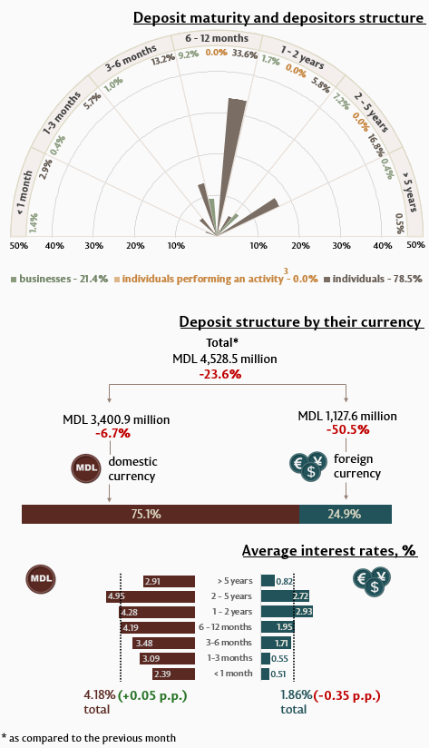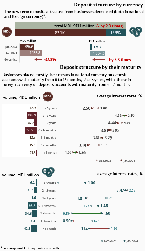 In January 2024, businesses’ deposits in domestic currency decreased by 32.8% while those in foreign currency - by 5.8 times, as compared to the previous month (Infographic 3). Businesses’ deposits in domestic currency amounted to MDL 796.9 million, while those in foreign currency – MDL 174.2 million.