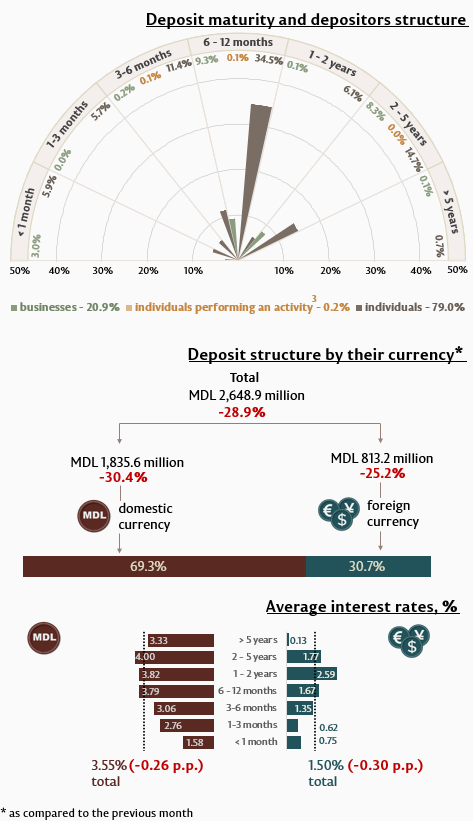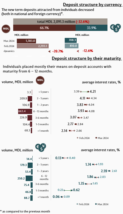 Individuals’ deposits amounted in March 2024 to MDL 2,091.3 million, decreasing by 32.6% as compared to the previous month (Infographic 2). The most requested were deposits with terms from 6 to 12 months, which accounted for 43.7% of the total deposits of individuals.