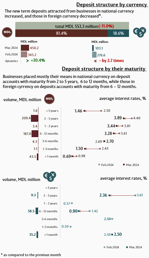 In March 2024, businesses’ deposits in domestic currency (Infographic 3) increased by 30.4%, while those in foreign currency decreased by 2.7 times respectively, as compared to the previous month. Businesses’ deposits in domestic currency amounted to MDL 450.2 million, while those in foreign currency – MDL 103.1 million.