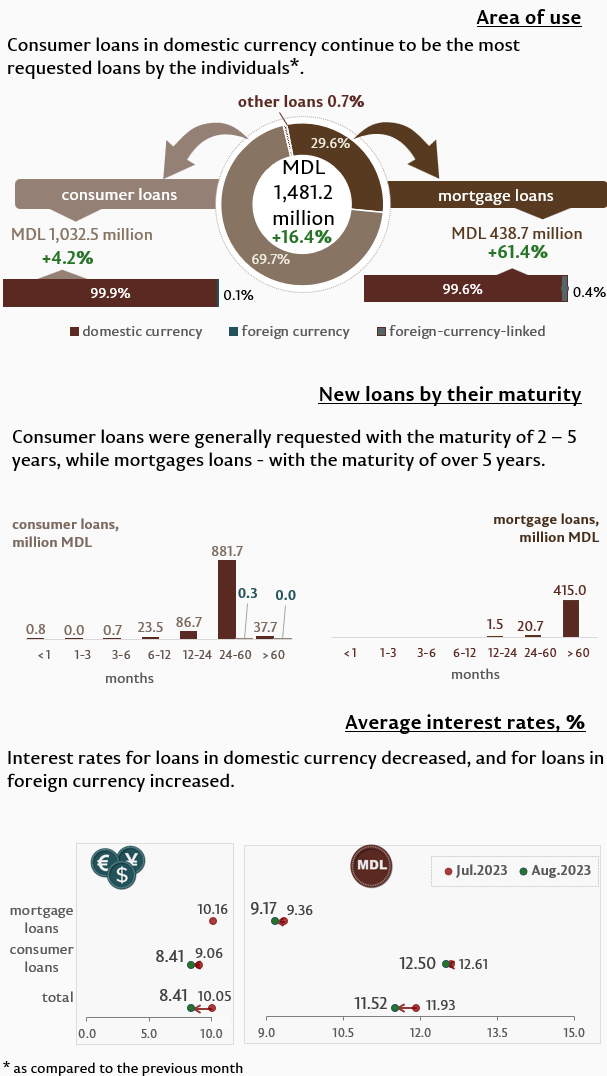 In august 2023, individuals contracted new loans (Infographic 2) in the amount of MDL 1,481.2 million, increasing by 16.4% as compared to the previous month, the largest share (69.7%) representing consumer loans. The largest share of these loans (MDL 881.7 million) was extended in domestic currency with a maturity ranging from 2 to 5 years.