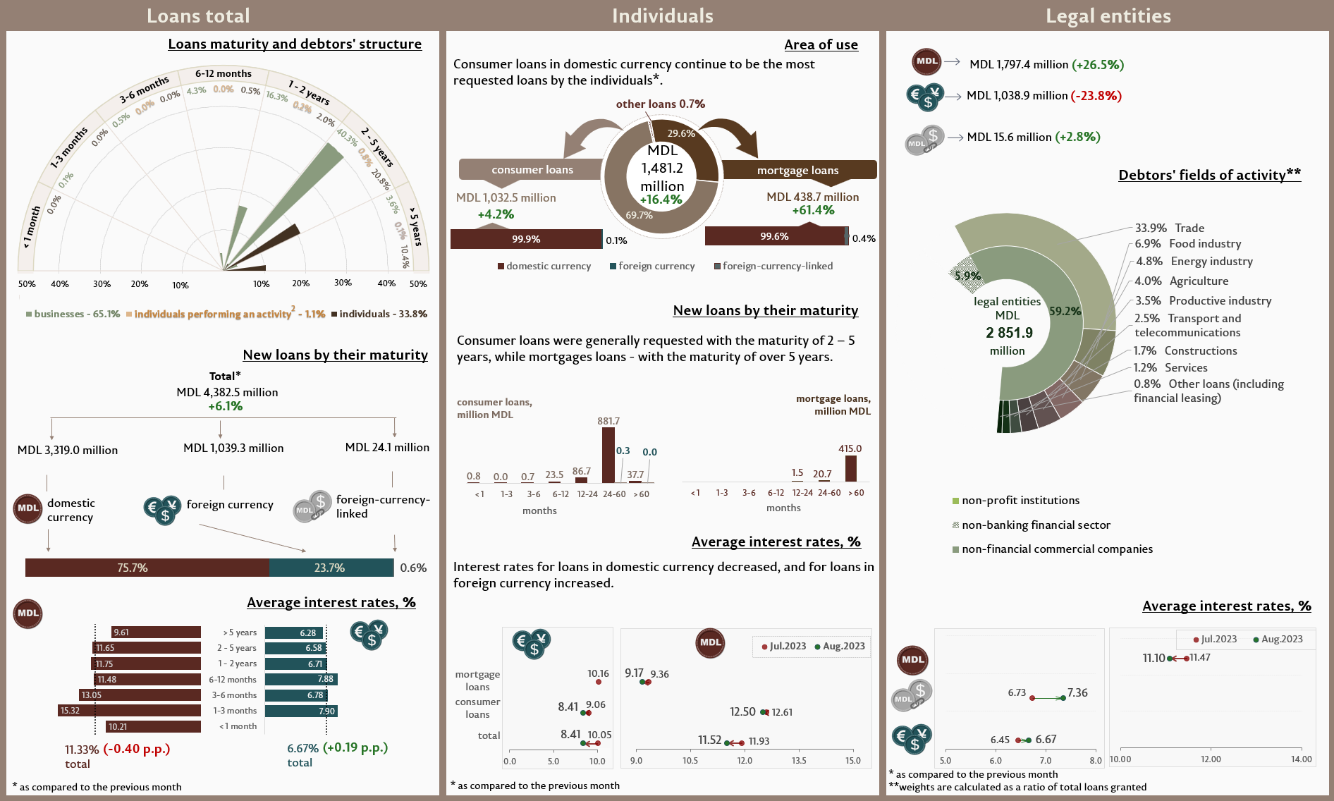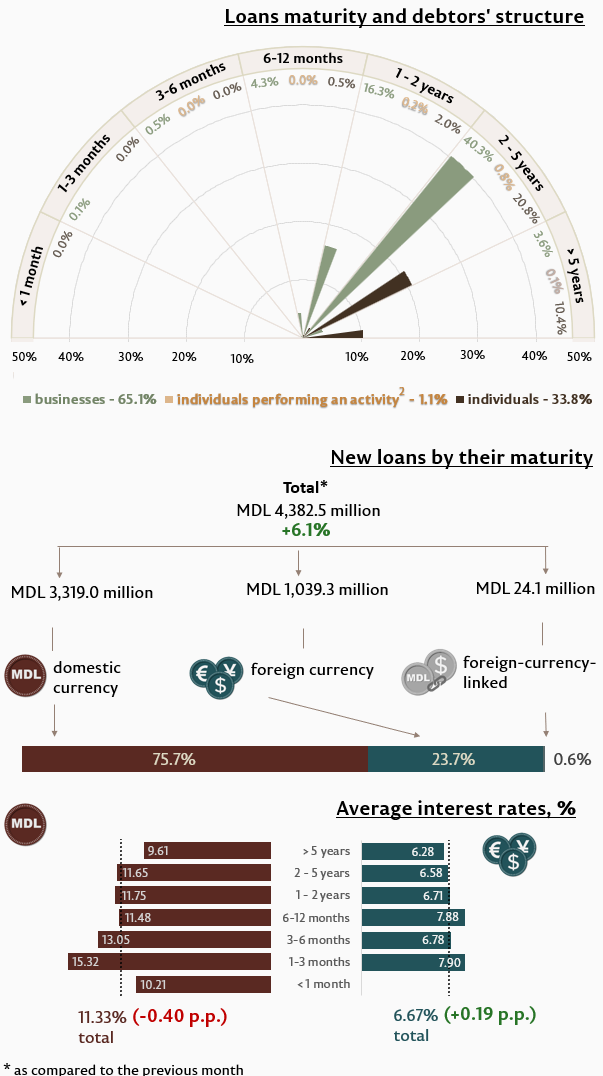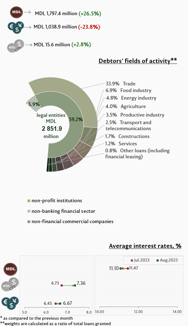 In august 2023, new loans extended1 (Infographic 1) totalled MDL 4,382.5 million, increasing by 6.1% compared to July 2023. The largest share (75.7%) belongs to domestic currency loans, which accounted for MDL 3,319.0 million, increasing by 21.4% as compared to the previous month.