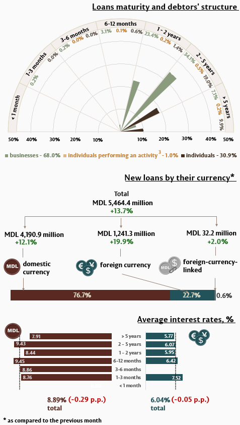 In June 2024, new loans extended1 (Infographic 1) amounted to MDL 5,464.4 million, increasing by 13.7% compared to May 2024. The largest share (76.7%) represents domestic currency loans, which tot alled MDL 4,190.9 million, increasing by 12.1% as compared to the previous month.