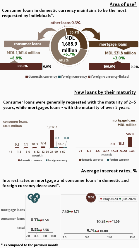 In June 2024, individuals contracted new loans (Infographic 2) in total amount of MDL 1,688.9 million, increasing by 6.7% as compared to the previous month, the largest share (68.8%) representing consumer loans. The largest part of these loans (MDL 1,012.7 million) was extended in domestic currency with a maturity ranging from 2 to 5 years.