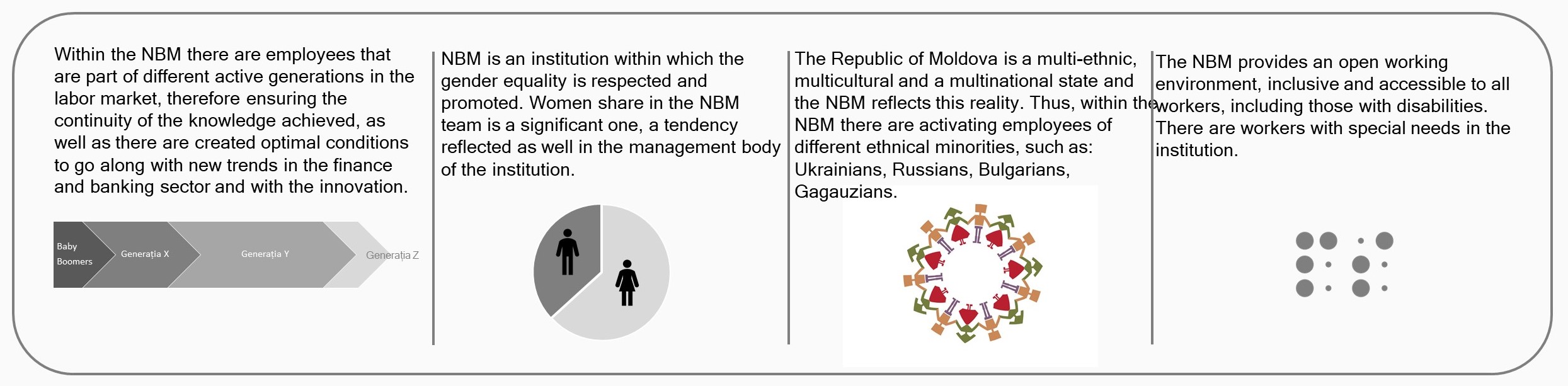 The NBM aims to reflect our society in all its diversity so that the best professionals of different ages, ethnicities, geographic locations, life experiences can contribute to the optimal achievement of the National Bank's core objective and tasks, respectively, the importance of respecting equity, diversity and inclusion being a priority in the NBM staff policy.
