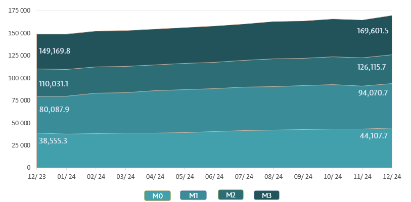 Money supply M25 increased by MDL 3,577.3 million or by 2.9% compared to November 2024 and amounted to MDL 126,115.7 million, being 14.6% higher than in the similar period of the previous year (Chart 2).