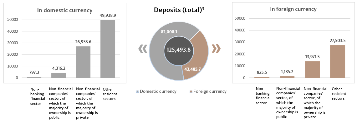 The balance of deposits in domestic currency increased by MDL 2,800.0 million compared to the previous month and amounted to MDL 82,008.1 million, representing a share of 65.3% of the total balance of deposits. At the same time, the balance of deposits in foreign currency (recalculated in MDL) increased by MDL 1,025.6 million to MDL 43,485.7 million, as compared to the previous month, having a share of 34.7% (Chart 3).