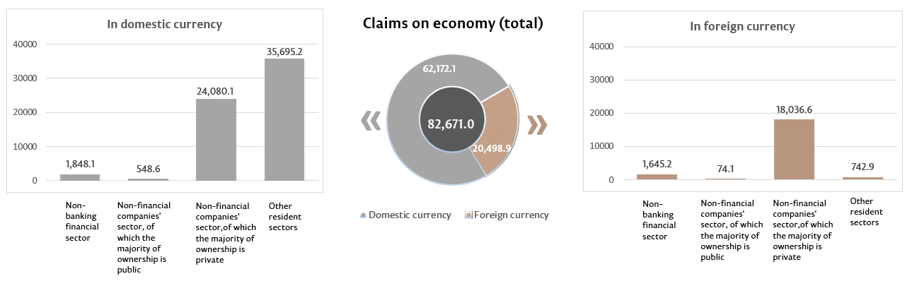 10. Claims on domestic economy represent claims of the banking system of the Republic of Moldova (including banks in the process of liquidation), in domestic and in foreign currencies, on non-financial commercial companies which majority ownership is public or private, on other resident sectors. This indicator includes loans and borrowings (including overdue debt), overdue interest on loans; debt securities and shares; other claims.