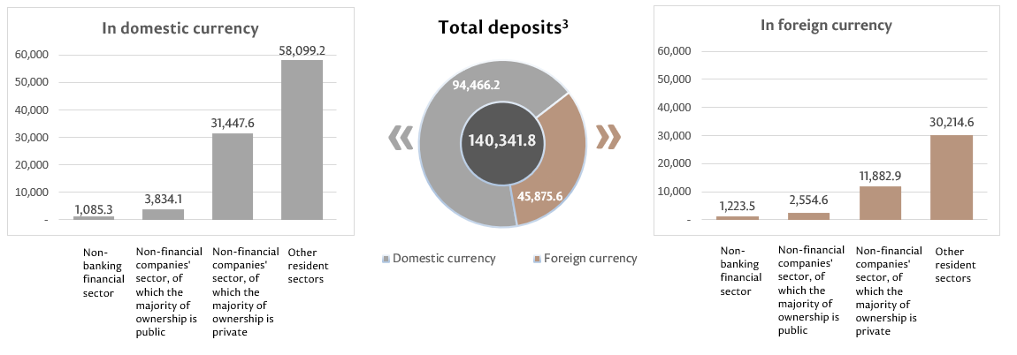 The balance of deposits in domestic currency amounted to MDL 94,466.2 million, increasing by MDL 4,916.5 million compared to the previous month and representing a share of 67.3% of the total balance of deposits. At the same time, the balance of deposits in foreign currency (recalculated in MDL) amounted to MDL 45,875.6 million, increasing by MDL 661.9 million compared to the previous month, representing 32.7% of the total balance of deposits (Chart 3).