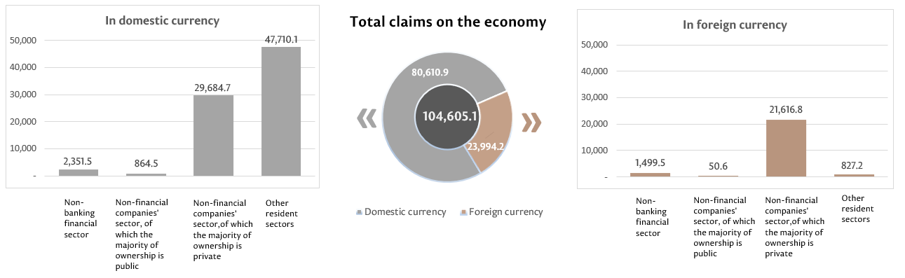 10. Claims on national economy represent the claims of the banking system of the Republic of Moldova (including banks in the process of liquidation), in domestic and in foreign currencies, on the non-banking financial sector, non-financial commercial companies, as well as on other resident sectors. This indicator includes loans and borrowings (including amounts in arrears), debt securities, shares and other claims.