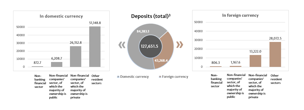 The balance of deposits in domestic currency increased by MDL 1,693.8 million compared to the previous month and amounted to MDL 84,383.1 million, representing a share of 66.1% of the total balance of deposits. At the same time, the balance of deposits in foreign currency (recalculated in MDL) increased by MDL 171.6 million to MDL 43,268.4 million, as compared to the previous month, having a share of 33.9% (Chart 3).