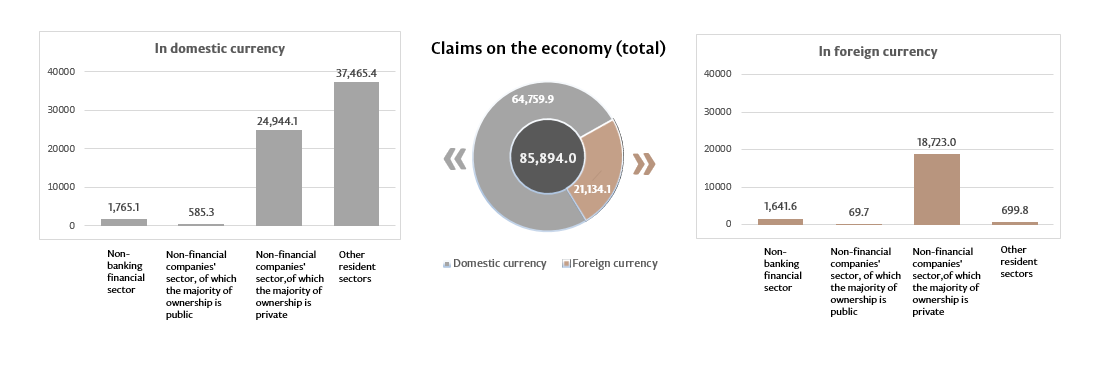 10. Claims on domestic economy represent claims of the banking system of the Republic of Moldova (including banks in the process of liquidation), in domestic and in foreign currencies, on non-financial commercial companies which majority ownership is public or private, on other resident sectors. This indicator includes loans and borrowings (including overdue debt), overdue interest on loans; debt securities and shares; other claims.