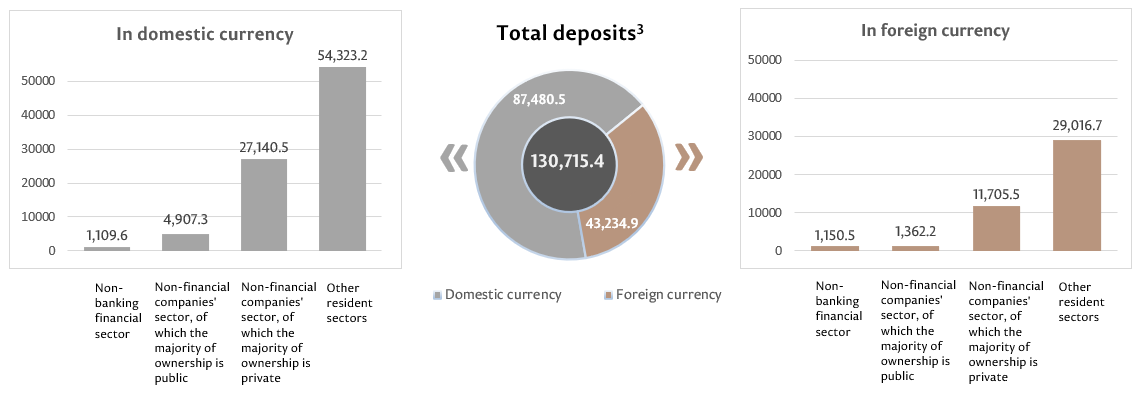 The balance of deposits in domestic currency increased by MDL 557.0 million compared to the previous month and amounted to MDL 87,480.5 million, representing a share of 66.9% of the total balance of deposits. At the same time, the balance of deposits in foreign currency (recalculated in MDL) increased by MDL 439.6 million to MDL 43,234.9 million, as compared to the previous month, representing 33.1% of the total balance of deposits (Chart 3).