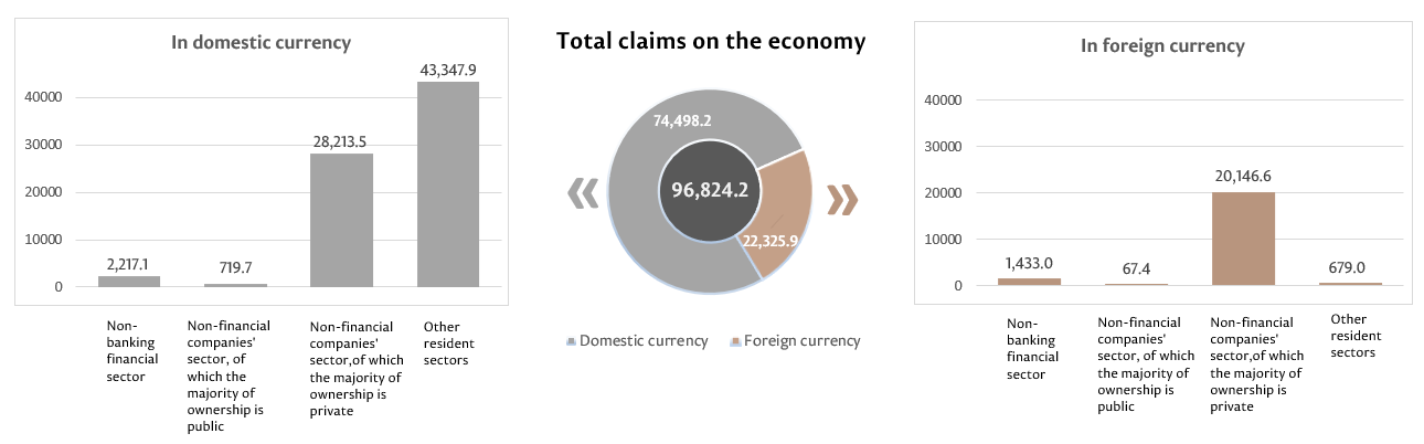 10. Claims on national economy represent claims of the banking system of the Republic of Moldova (including banks in the process of liquidation), in domestic and in foreign currencies, on non-banking financial sector, non-financial commercial companies which majority ownership is public or private, on other resident sectors. This indicator includes loans and borrowings (including amounts in arrears), debt securities, shares and other claims.