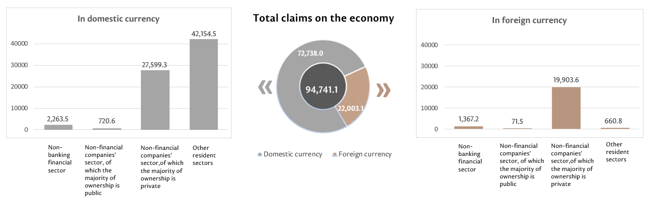 10. Claims on national economy represent claims of the banking system of the Republic of Moldova (including banks in the process of liquidation), in domestic and in foreign currencies, on non-banking financial sector, non-financial commercial companies which majority ownership is public or private, on other resident sectors. This indicator includes loans and borrowings (including amounts in arrears), debt securities, shares and other claims.