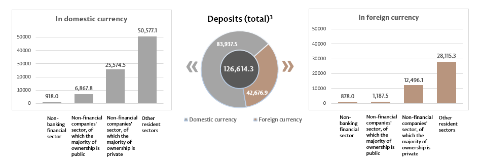 The balance of deposits in domestic currency decreased by MDL 445.6 million compared to the previous month and amounted to MDL 83,937.5 million, representing a share of 66.3% of the total balance of deposits. At the same time, the balance of deposits in foreign currency (recalculated in MDL) decreased by MDL 591.6 million to MDL 42,676.9 million, as compared to the previous month, having a share of 33.7% (Chart 3).