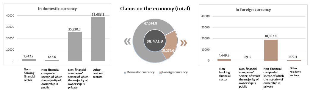 10. Claims on domestic economy represent claims of the banking system of the Republic of Moldova (including banks in the process of liquidation), in domestic and in foreign currencies, on non-financial commercial companies which majority ownership is public or private, on other resident sectors. This indicator includes loans and borrowings (including overdue debt), overdue interest on loans; debt securities and shares; other claims.